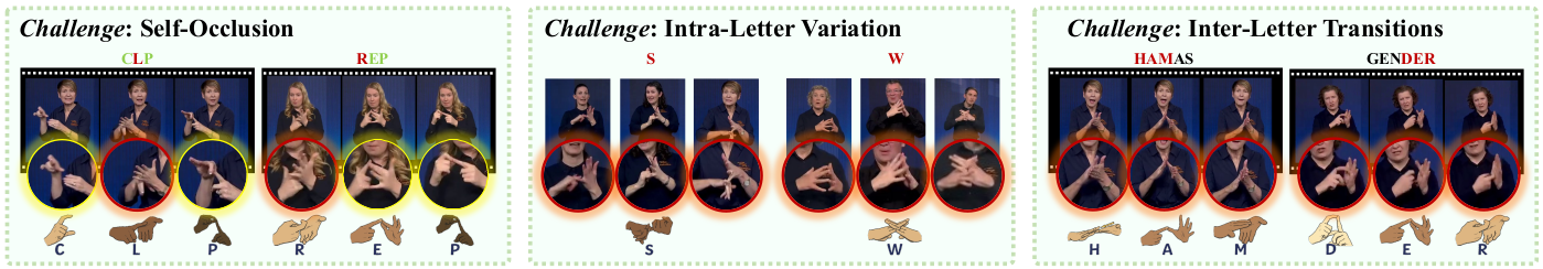 Two-handed system introduces significant challenges for machine translation, such as frequent self-occlusion, high intra-letter variations, and rapid handshape transitions. Our proposed dataset captures the visual and articulatory complexities inherent in two-handed finger-spelling systems, underscoring the challenges of accurate fingerspelling recognition in BANZSL. As shown in follow image, it highlights key visual challenges specific to two-handed fingerspelling systems, such as self-occlusion, intra-letter variation, and rapid inter-letter transitions, further underscoring the complexity of accurate fingerspelling recognition and translation in BANZSL.