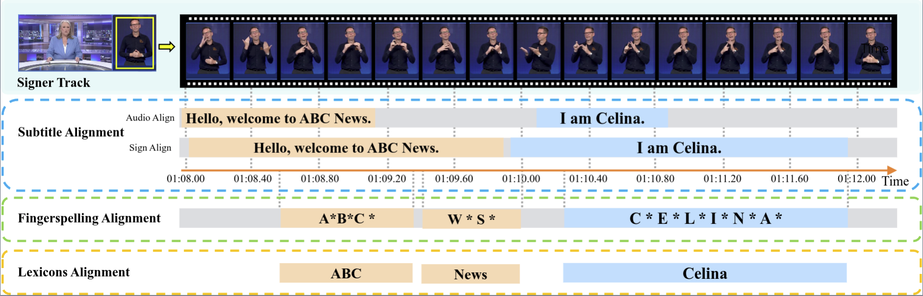 Cleaning. All original videos are accompanied by standard English dubbing and subtitles. We retrieve subtitles for each complete video, formatted as “[Start Time] subtitle [End Time]”, with timing aligned to the spoken dubbing. Following the subtitle cleaning strategy proposed in Auslan-Daily, we perform simple cleaning operations: merge fragments ending in commas with their subsequent lines, split overlapping subtitles into separate sentences, and discard entries with only non-semantic fillers. As a result, we obtain approximately 30K complete and cleaned subtitles requiring further alignment with fingerspelling segments.