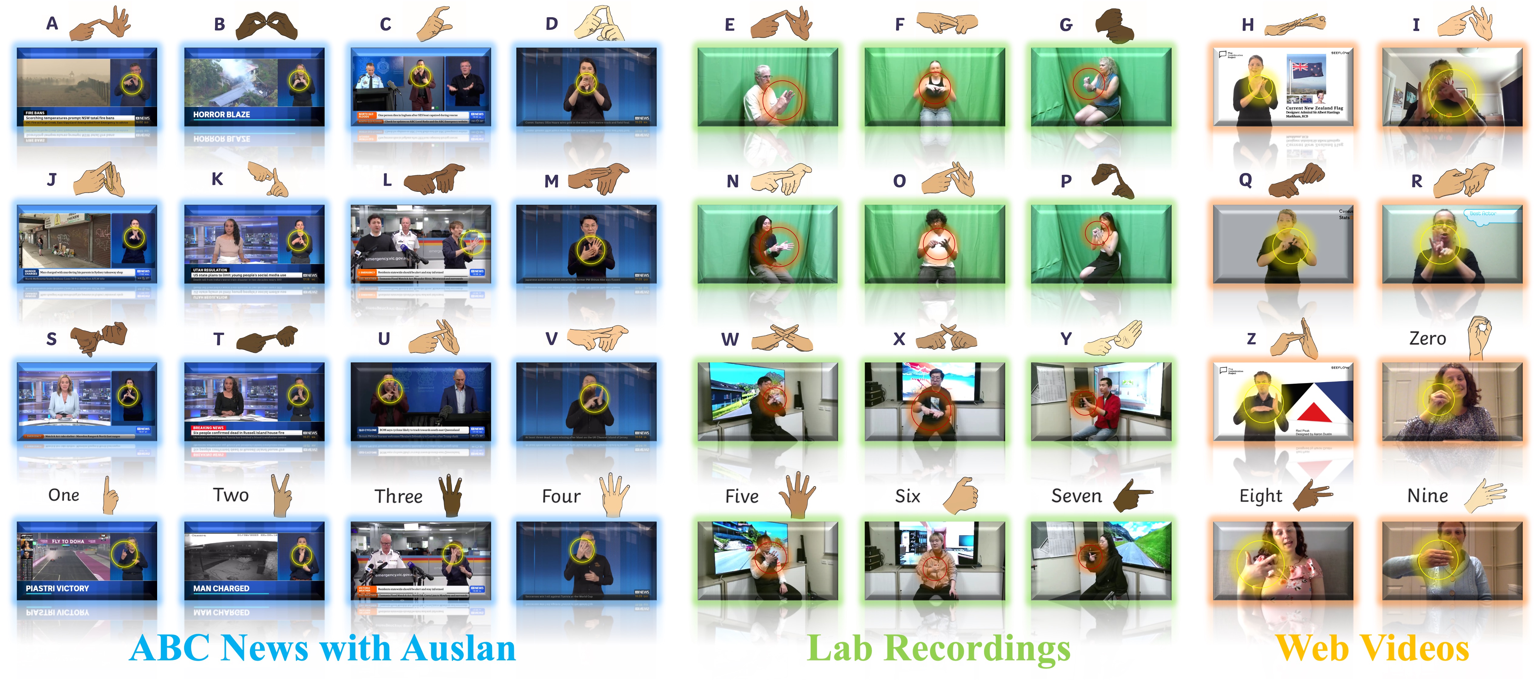 Collection. “ABC News with Auslan” and YouTube sources are open sources. Beginning in 2022, “ABC News with Auslan” has provided weekly broadcasts covering key domestic and international news events, as well as weather forecasts. It is an ongoing program, and previous work aligned 45 videos collected up to May 2023, along with a small number of fingerspelling annotations. In this work, we extend the collection by acquiring an additional 80 videos spanning from May 2023 to April 2025. These broadcasts feature live sign language translation (simultaneous interpretation) by Auslan experts, intended for deaf and hearing-impaired viewers. News content inherently includes a rich set of fingerspelling scenarios, such as personal names, place names, organization names, phone numbers, and other proper nouns, making it an ideal source for studying fingerspelling phenomena. To further diversify our dataset, we also include several high-quality publicly available documentaries and educational videos interpreted with BSL and NZSL, primarily sourced from YouTube. These videos typically feature daily conversations, learning activities, or introductions to specific topics.