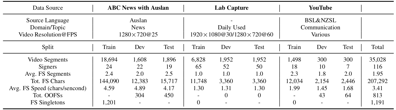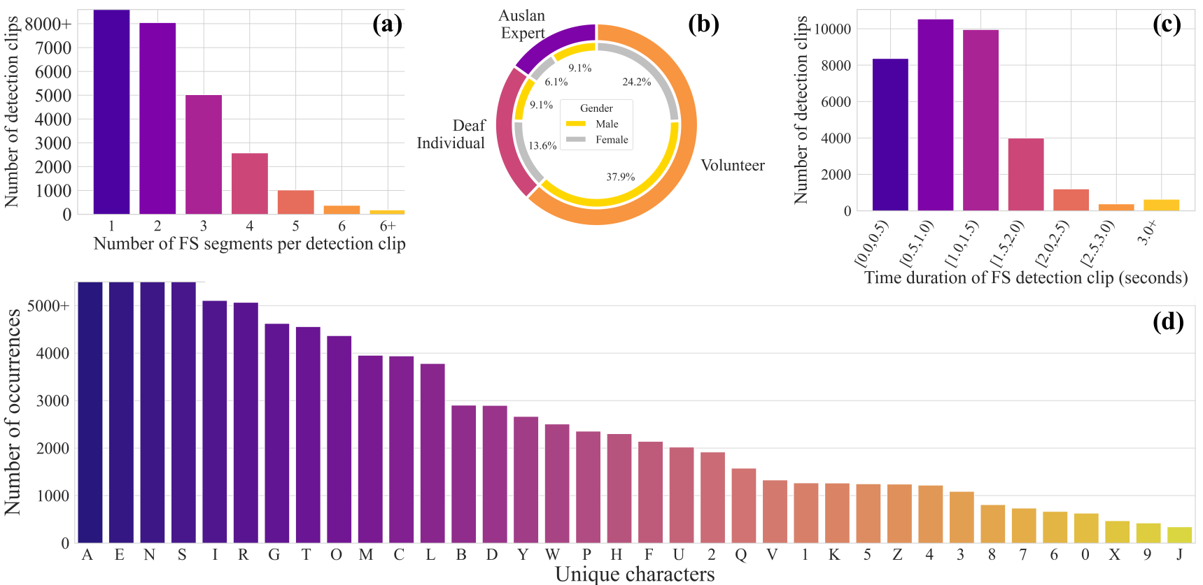 We present key statistics of BANZ-FS to highlight the diversity and complexity of the dataset. BANZ-FS consists of over 35,000 annotated video segments sourced from news broadcasts, lab recordings, and online videos, covering 116 unique signers. The dataset is split into training, development, and test sets to facilitate fair evaluation of fingerspelling-related tasks. We segment each video by applying a 10-second sliding window around any detected FS segment. As a result, each detection clip may contain multiple FS instances. As shown in Figure 3, most clips contain only 1–2 FS segments and last less than 1.5 seconds, indicating that FS is often embedded briefly within continuous signing. Furthermore, the signer population includes a balanced mix of Auslan experts, deaf individuals, and volunteers, offering a wide range of signing styles and linguistic competence. The FS character distribution reveals a long-tail pattern: common letters such as A, E, and N appear frequently, while rare characters (e.g., numerals and less frequent letters) occur sparsely. This imbalance poses additional challenges for generalization and open-vocabulary recognition, especially in low-resource conditions.