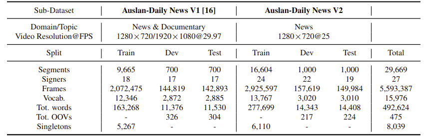 Above Table presents a detailed comparison between the Auslan-Daily News V1 and V2 sub-datasets in terms of data volume, diversity, and vocabulary statistics. V2 significantly expands upon V1, featuring nearly twice the number of annotated segments (29,669 vs. 11,065), frames (5.6M vs. 2.3M), and total words (492,624 vs. 188,774). It also includes a larger vocabulary size (15,976 vs. 12,346) and more signers (27 vs. 18), reflecting improved linguistic and signer diversity. The number of out-of-vocabulary (OOV) words and singletons further illustrates the dataset’s long-tail distribution, which presents both challenges and opportunities for robust model training and generalization.